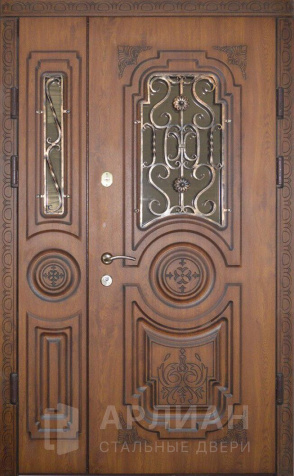 Двухстворчатая входная дверь со стеклом и ковкой №9